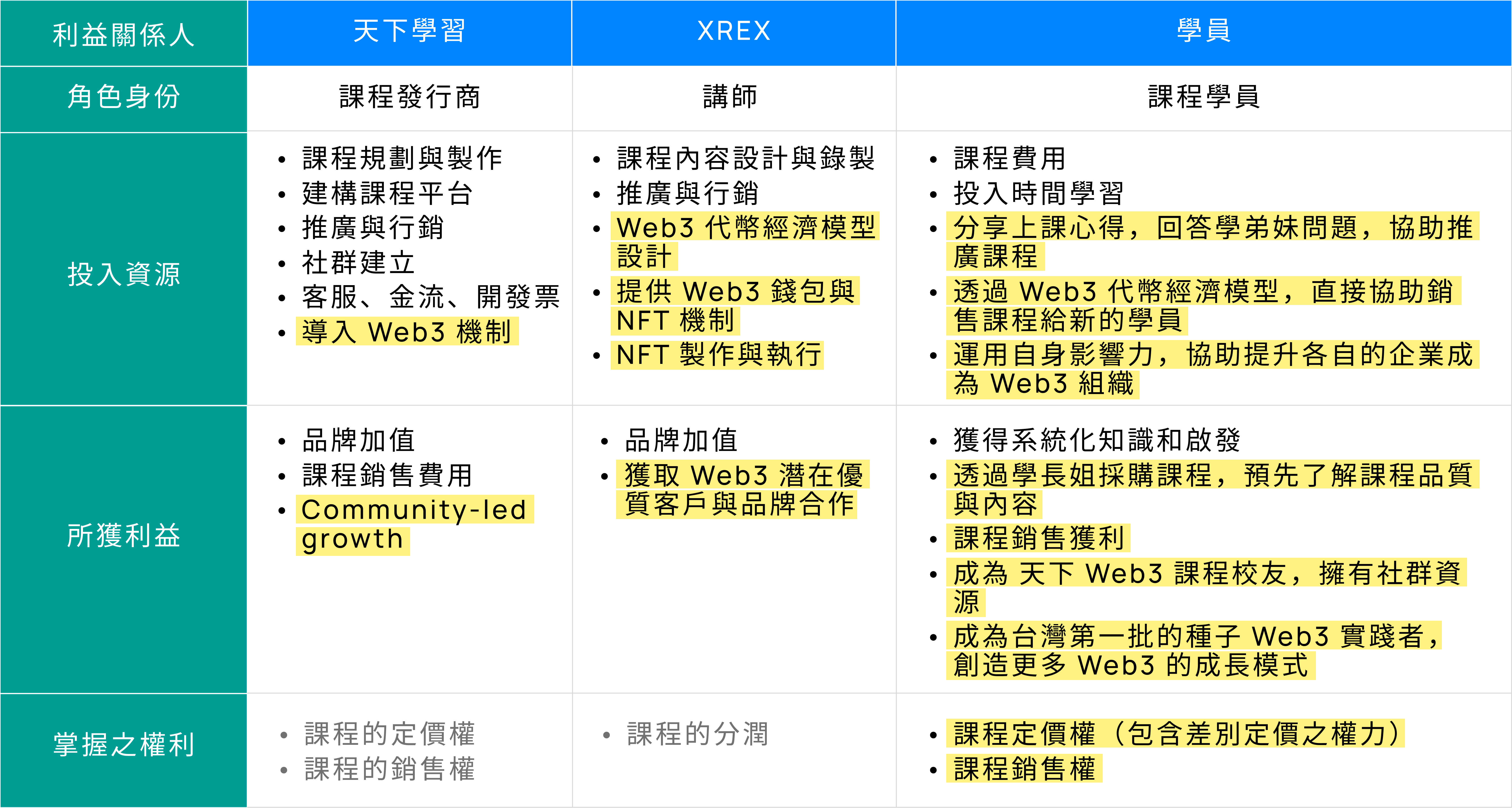 在導入 Web3 代幣經濟後,我們可以看到既有的經濟體出現巨大變化,利益關係人不僅分別獲得了新的利益,同時為了確保 Web3 機制的運轉而放棄了既有權利: